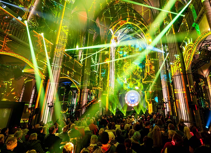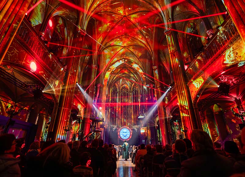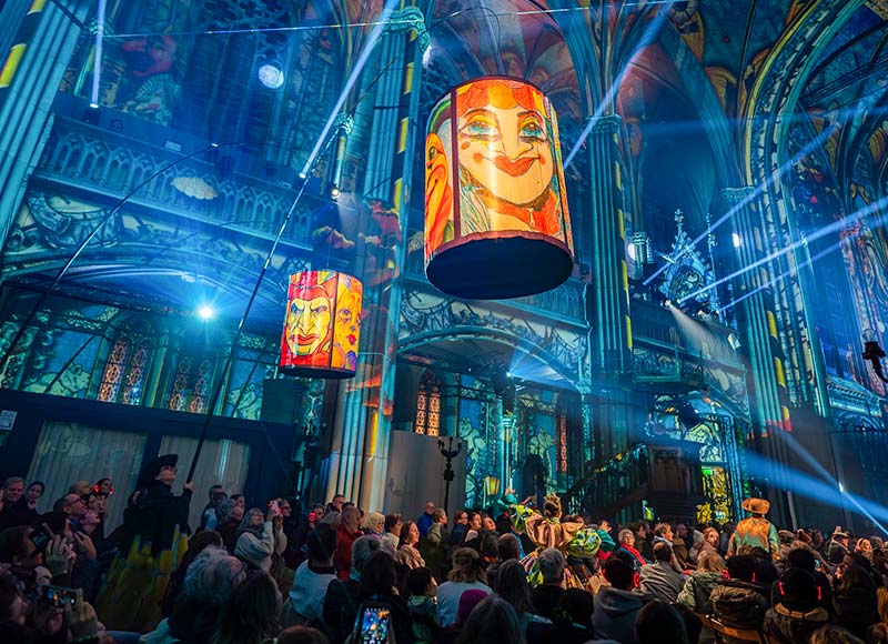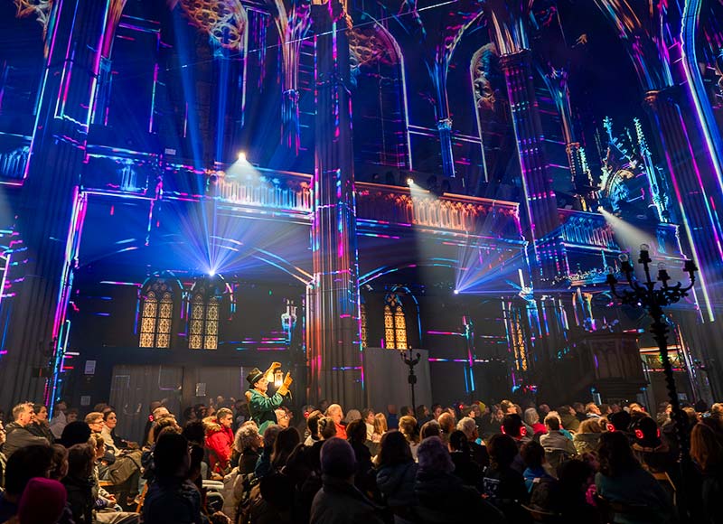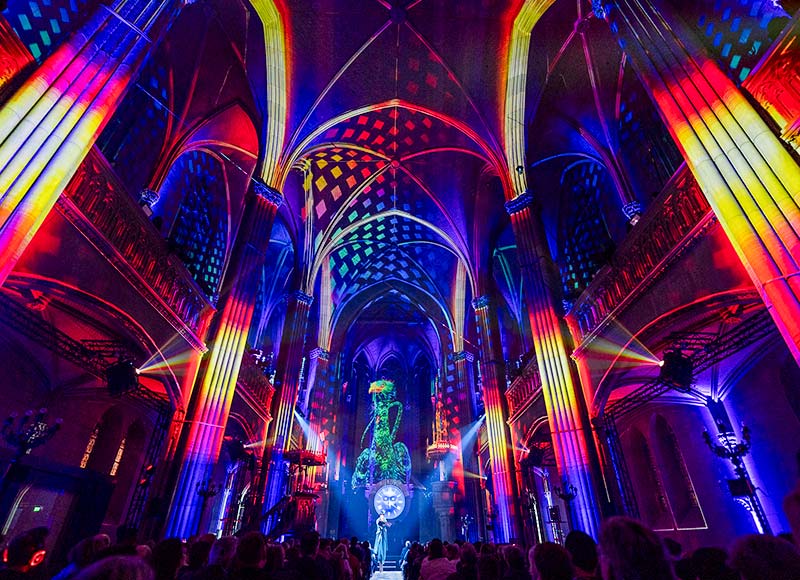 Unter den Gewölben der Enge Kirche erwacht Die vergessene Legende von Zürich zu neuem Leben – in einer immersiven Show mit Video-Mapping, Licht, Klang und Luftchoreografien.